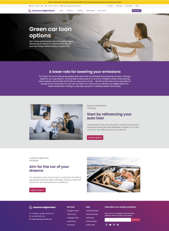 | Personal | Going Green Prospect (B2C) | Display Green Car loan-Promo. | Visitors who visit the site with the following utm parameter added to their URL: utm_campaign=summer_car_Loans | The Personal page banner is personalized with messaging specific to Green Car Loans, guiding prospects toward the loan application process. |